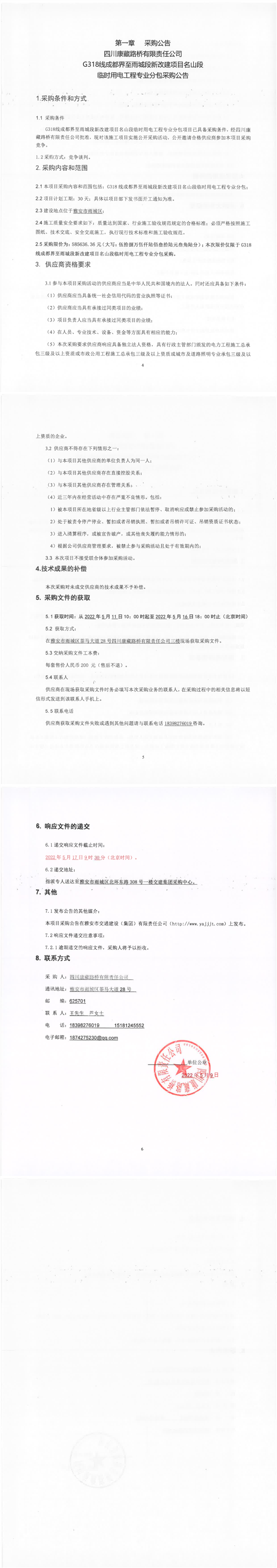四川康藏路橋有限責(zé)任公司G318線成都界至雨城段新改建項(xiàng)目名山段臨時(shí)用電工程專業(yè)分包采購公告