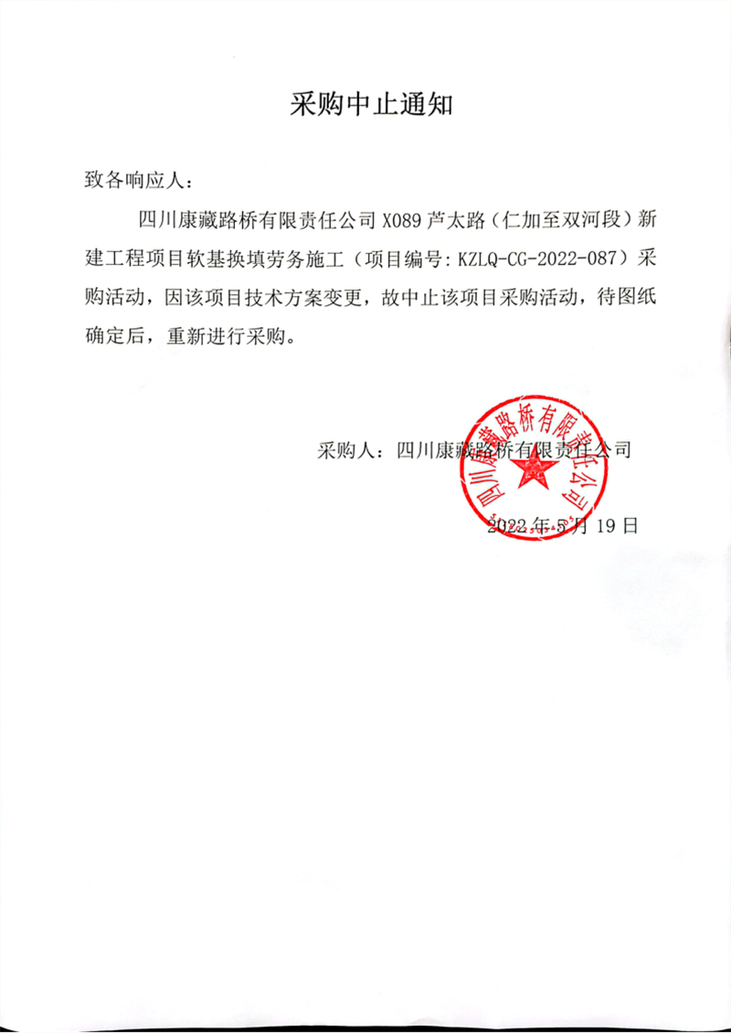 四川康藏路橋有限責(zé)任公司X089蘆太路(仁加至雙河段)新建工程項(xiàng)目軟基換填勞務(wù)施工采購(gòu)中止通知