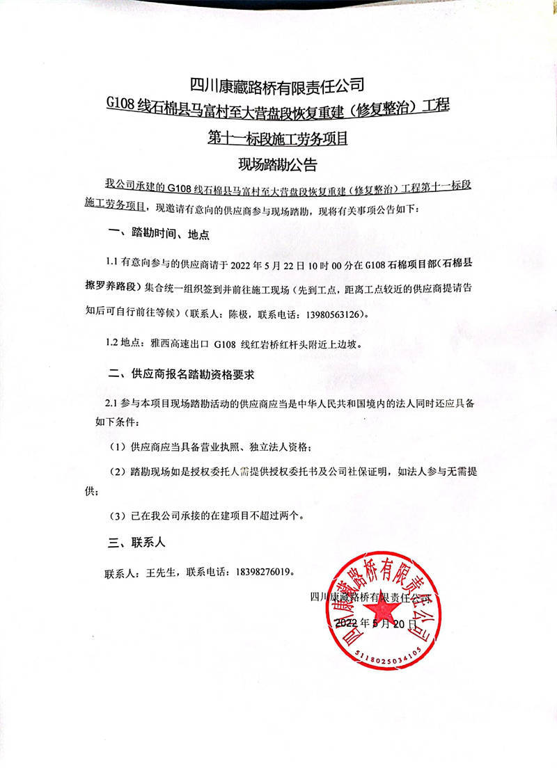 四川康藏路橋有限責(zé)任公司G108線石棉縣馬福村至大營(yíng)盤段恢復(fù)重建(修復(fù)整治)工程第十一標(biāo)段施工勞務(wù)項(xiàng)目現(xiàn)場(chǎng)踏勘公告