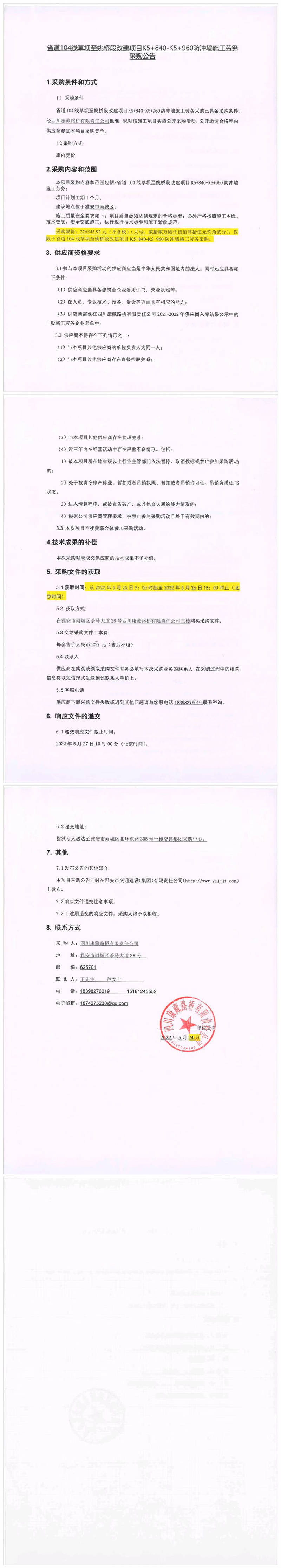 四川康藏路橋有限責(zé)任公司省道104線草壩至姚橋段改建項目K5+840-K5+960防沖墻施工勞務(wù)采購公告