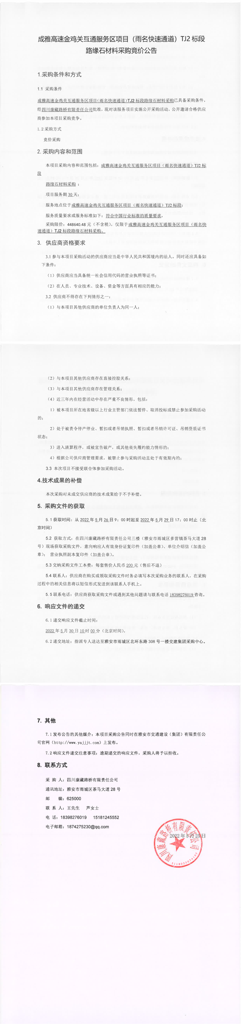 四川康藏路橋有限責任公司成雅高速金雞關(guān)互通服務(wù)區(qū)項目(雨名快速通道)TJ2標段路緣石材料采購競價公告