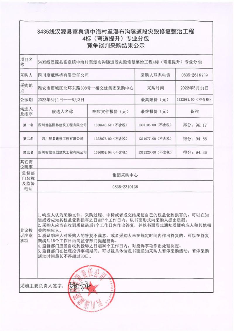 四川康藏路橋有限責任公司S435線漢源縣富泉鎮(zhèn)中海村至瀑布溝隧道段災(zāi)毀修復(fù)整治工程4標(彎道提升)專業(yè)分包競爭談判采購結(jié)果公示
