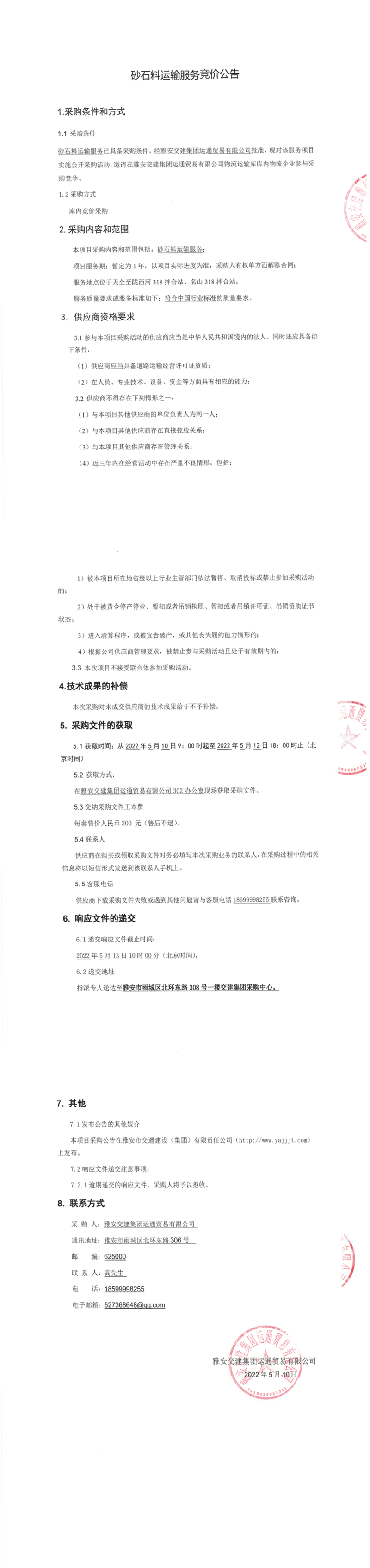 雅安交建集團(tuán)運(yùn)通貿(mào)易有限公司砂石料運(yùn)輸服務(wù)競價公告