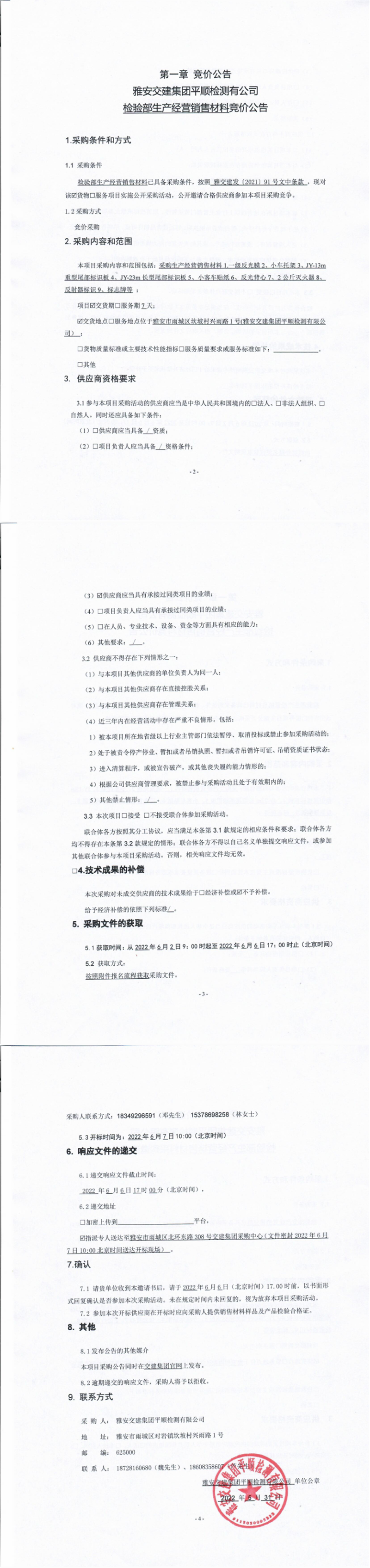 雅安交建集團(tuán)平順檢測有限公司檢驗(yàn)部生產(chǎn)經(jīng)營銷售材料競價(jià)公告