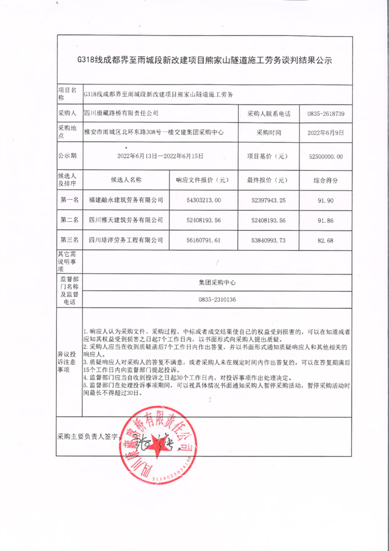 四川康藏路橋有限責任公司G318線成都界至雨城段新改建項目熊家山隧道施工勞務談判結果公示