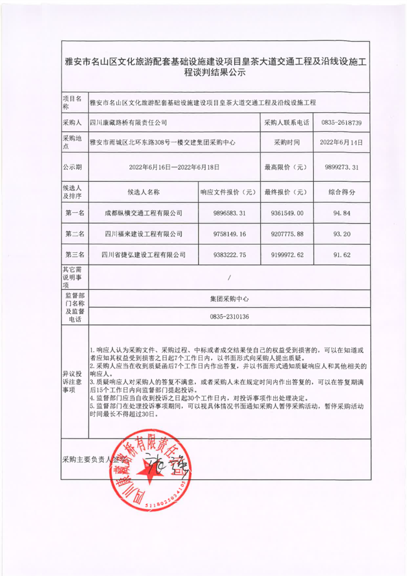 四川康藏路橋有限責(zé)任公司雅安市名山區(qū)文化旅游配套基礎(chǔ)設(shè)施建設(shè)項(xiàng)目皇茶大道交通工程及沿線設(shè)施工程談判結(jié)果公示
