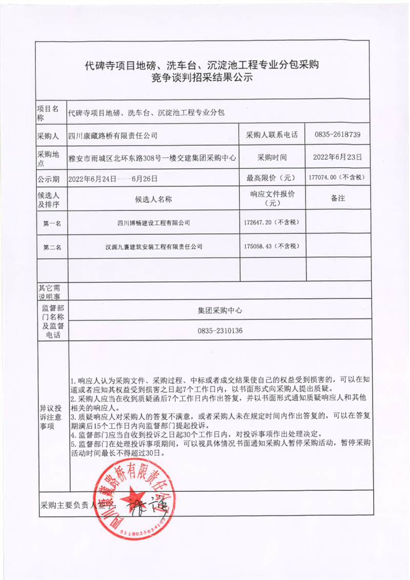 四川康藏路橋有限責(zé)任公司代碑寺項(xiàng)目地磅、洗車臺、沉淀池工程專業(yè)分包采購競爭談判招采結(jié)果公示