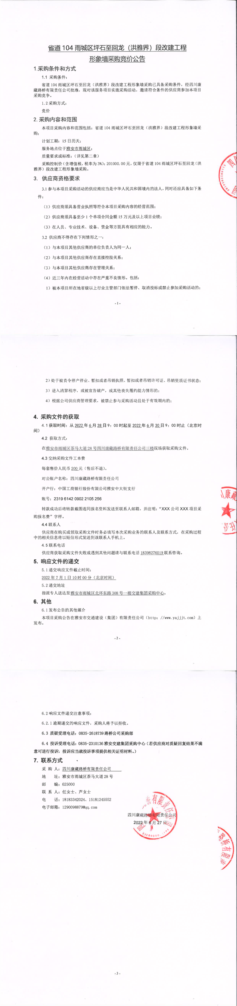 四川康藏路橋有限責(zé)任公司省道104雨城區(qū)坪石至回龍(洪雅界)段改建工程形象墻采購競價(jià)公告