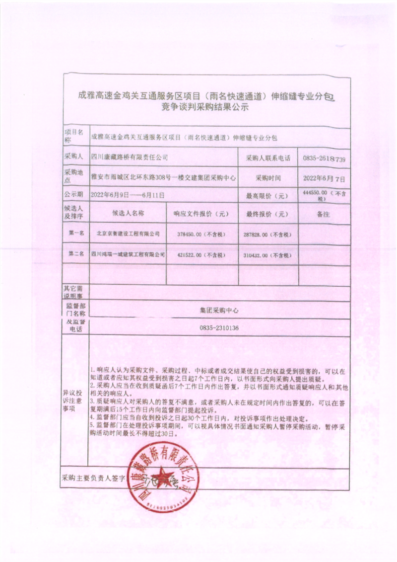 四川康藏路橋有限責(zé)任公司成雅高速金雞關(guān)互通服務(wù)區(qū)項(xiàng)目(雨名快速通道)伸縮縫工程專業(yè)分包競(jìng)爭(zhēng)談判采購(gòu)結(jié)果公示