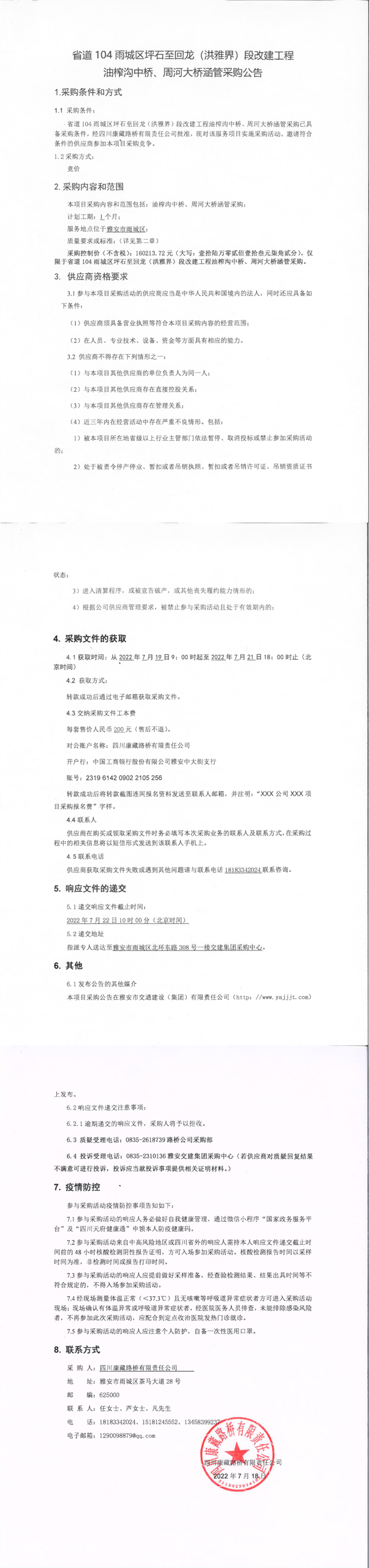 四川康藏路橋有限責任公司省道104雨城區(qū)坪石至回龍(洪雅界)段改建工程油榨溝中橋、周河大橋涵管采購公告