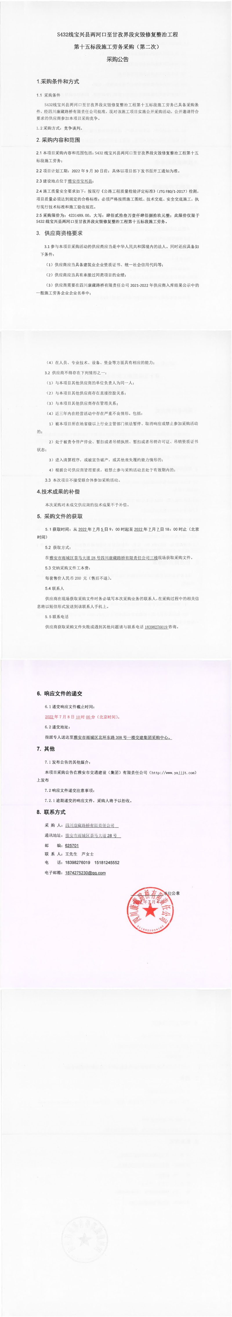 四川康藏路橋有限責任公司S432線寶興縣兩河口至甘孜界段災毀修復整治工程第十五標段施工勞務采購(第二次)采購公告