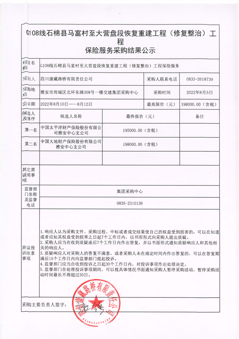 四川康藏路橋有限責(zé)任公司G108線石棉縣馬富村至大營(yíng)盤(pán)段恢復(fù)重建工程(修復(fù)整治)工程保險(xiǎn)服務(wù)采購(gòu)結(jié)果公示