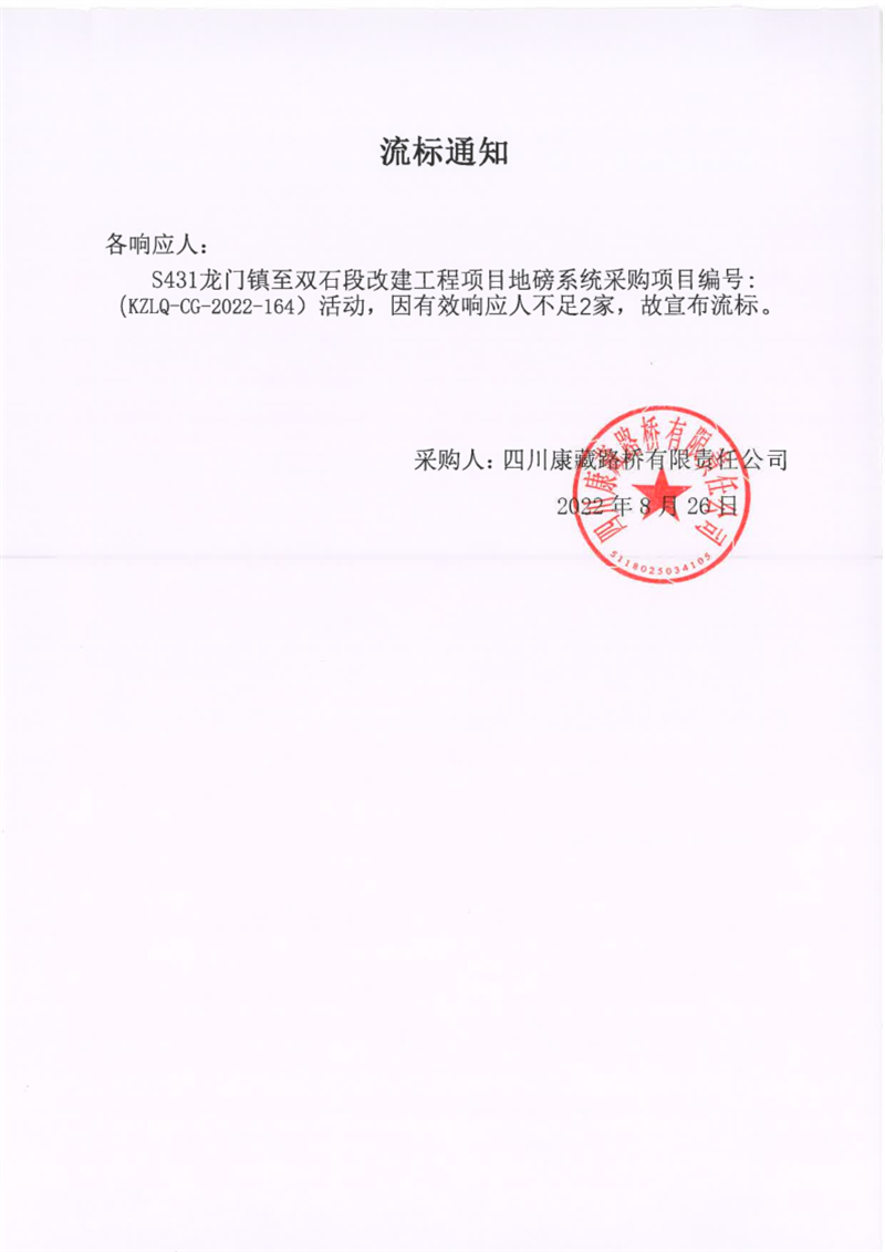 四川康藏路橋有限責(zé)任公司S431龍門鎮(zhèn)至雙石段改建工程項目地磅系統(tǒng)采購項目流標(biāo)通知