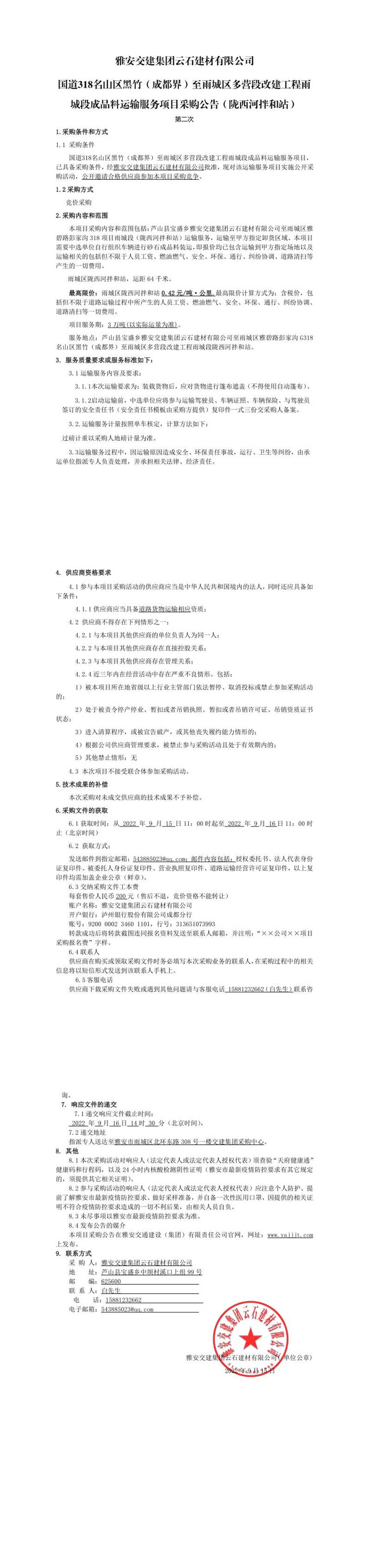 雅安交建集團云石建材有限公司國道318名山區(qū)黑竹(成都界)至雨城區(qū)多營段改建工程雨城段成品料運輸服務項目采購公告(隴西河拌和站)