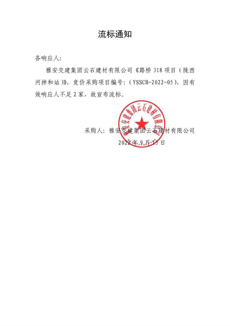 雅安交建集團云石建材有限公司成品料運輸服務(wù)采購(皇茶大道拌和站)流標通知