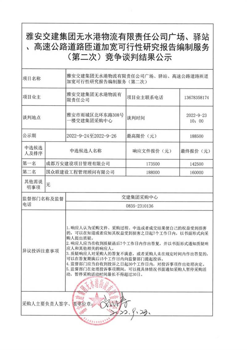 雅安交建集團無水港物流有限責任公司廣場、驛站、高速公路道路匝道加寬可行性研究報告編制服務(wù)(第二次)競爭談判結(jié)果公示