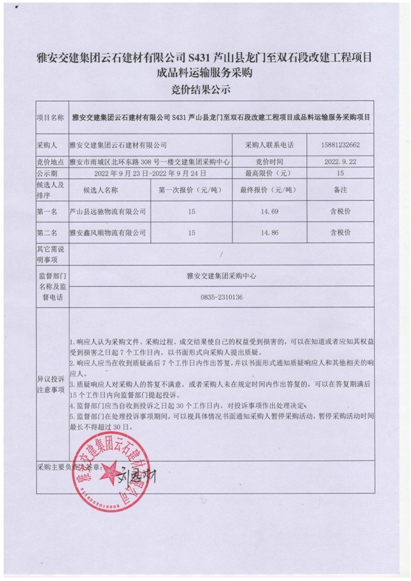 雅安交建集團(tuán)云石建材有限公司S431蘆山縣龍門至雙石段改建工程項(xiàng)目成品料運(yùn)輸服務(wù)采購競價(jià)結(jié)果公示