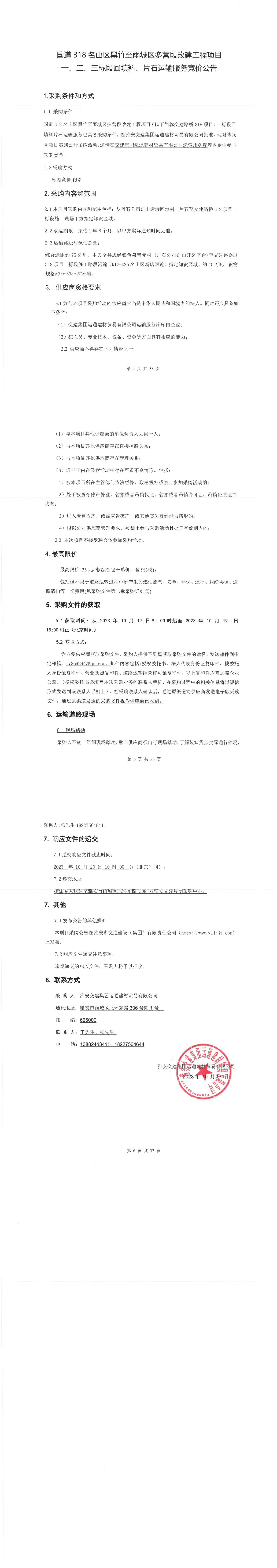 雅安交建集團(tuán)運(yùn)通建材貿(mào)易有限公司國道名山區(qū)黑竹至雨城區(qū)多營段改建工程項目一、二、三標(biāo)段回填料、片石運(yùn)輸服務(wù)競價公告