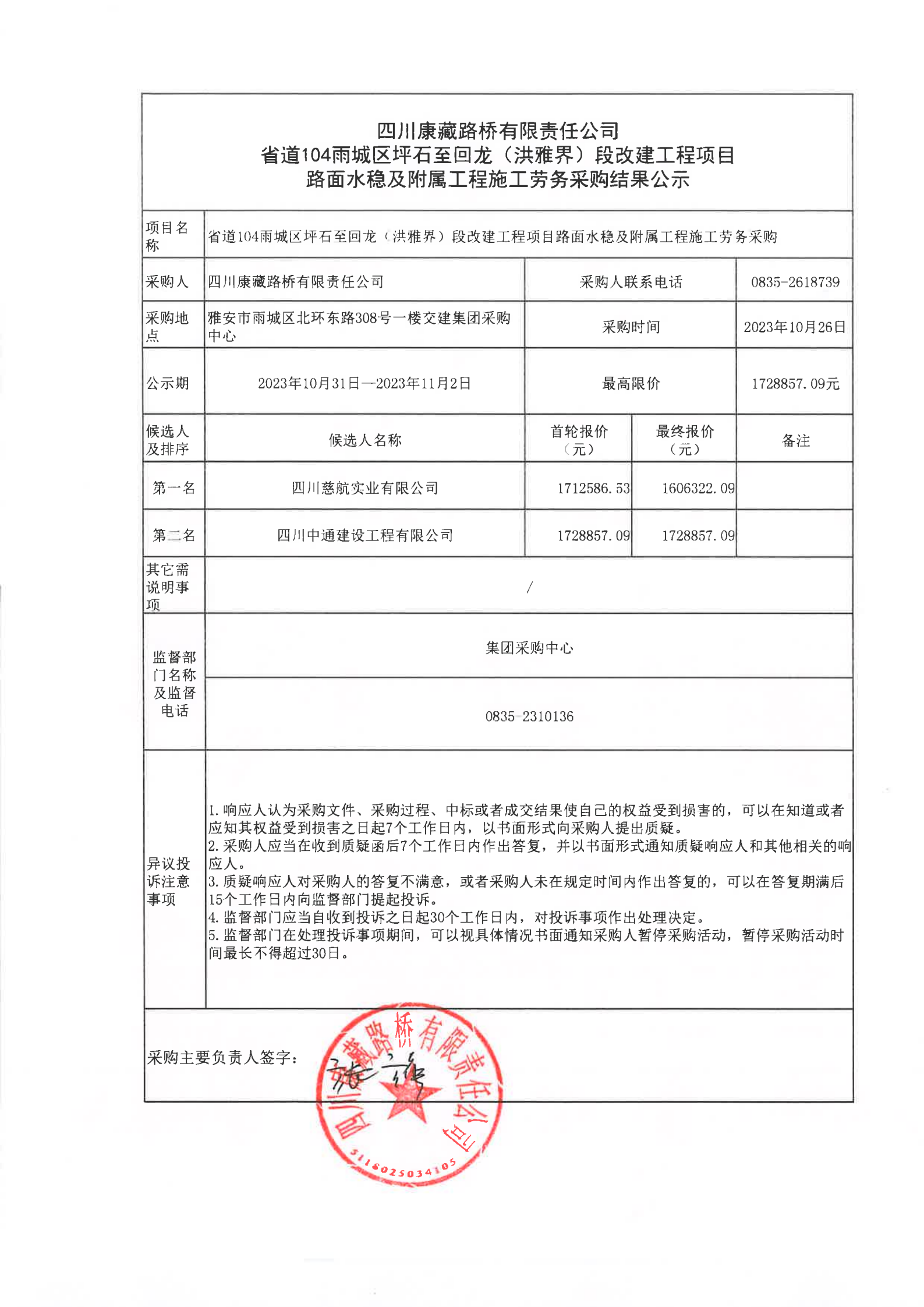 四川康藏路橋有限責任公司省道104雨城區(qū)坪石至回龍(洪雅界)段改建工程項目路面水穩(wěn)及附屬工程施工勞務采購結(jié)果公示