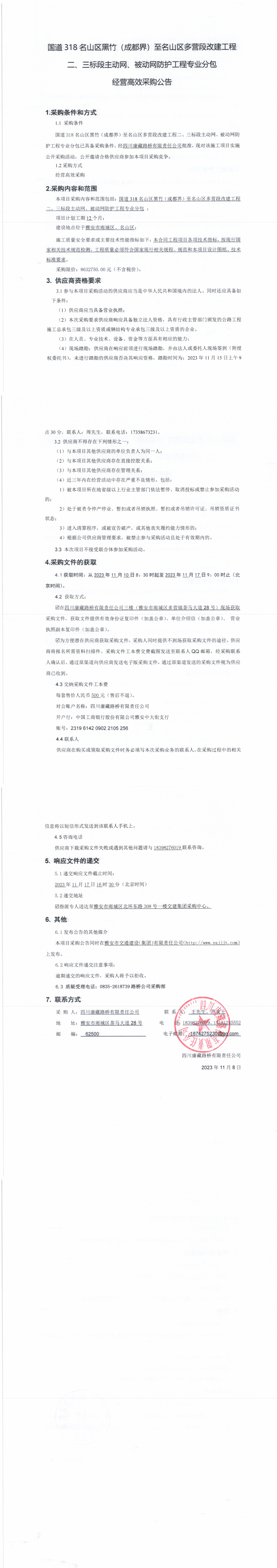 四川康藏路橋有限責(zé)任公司國道318名山區(qū)黑竹(成都界)至名山區(qū)多營段改建工程二、三標段主動網(wǎng)、被動網(wǎng)防護工程專業(yè)分包經(jīng)營高效采購公告