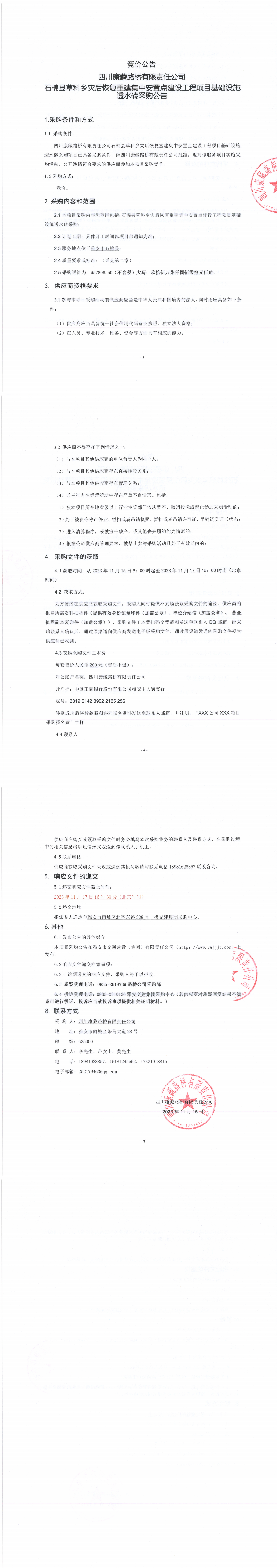 四川康藏路橋有限責任公司石棉縣草科鄉(xiāng)災(zāi)后恢復(fù)重建集中安置點建設(shè)工程項目基礎(chǔ)設(shè)施透水磚采購公告