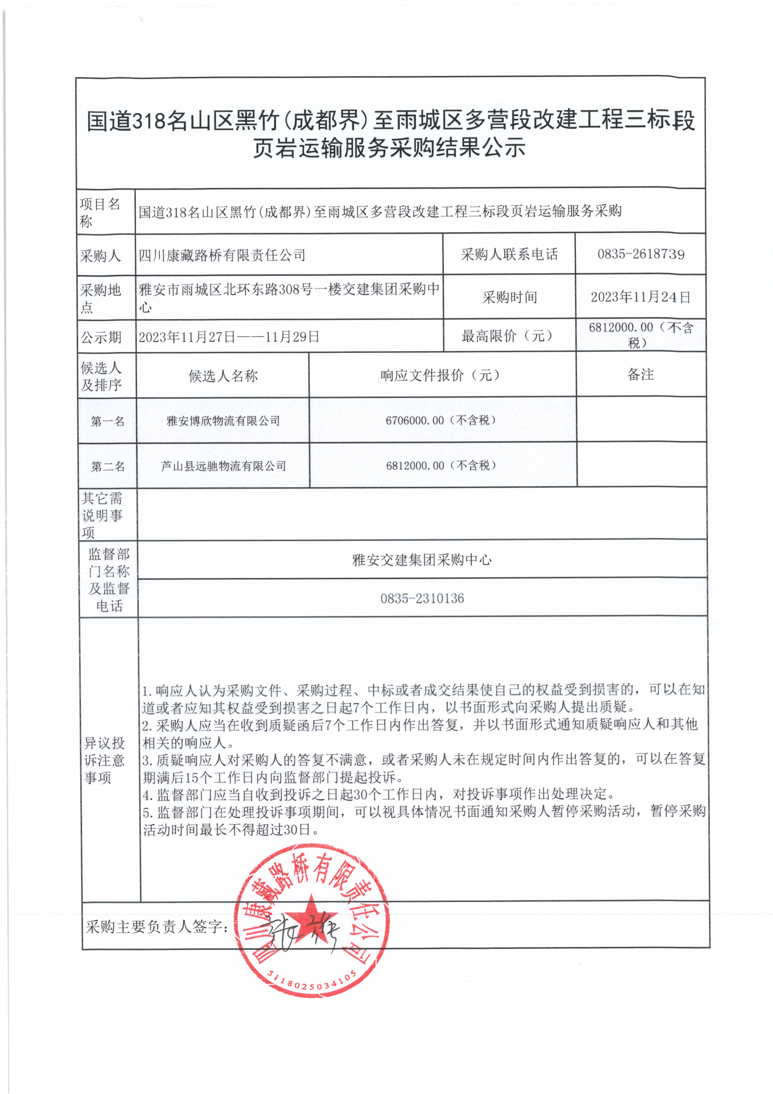 四川康藏路橋有限責(zé)任公司國(guó)道318名山區(qū)黑竹(成都界)至雨城區(qū)多營(yíng)段改建工程三標(biāo)段頁(yè)巖運(yùn)輸服務(wù)采購(gòu)結(jié)果公示