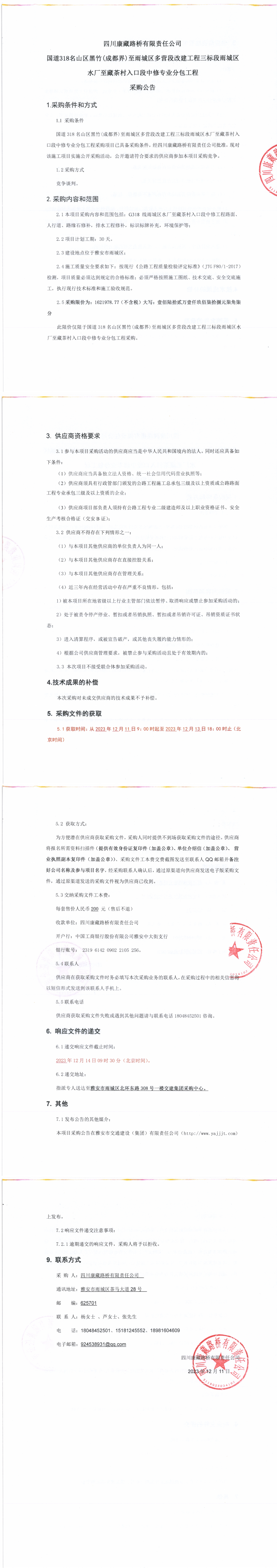 四川康藏路橋有限責(zé)任公司國道318名山區(qū)黑竹(成都界)至雨城區(qū)多營段改建工程三標(biāo)段雨城區(qū)水廠至藏茶村入口段中修專業(yè)分包工程采購公告
