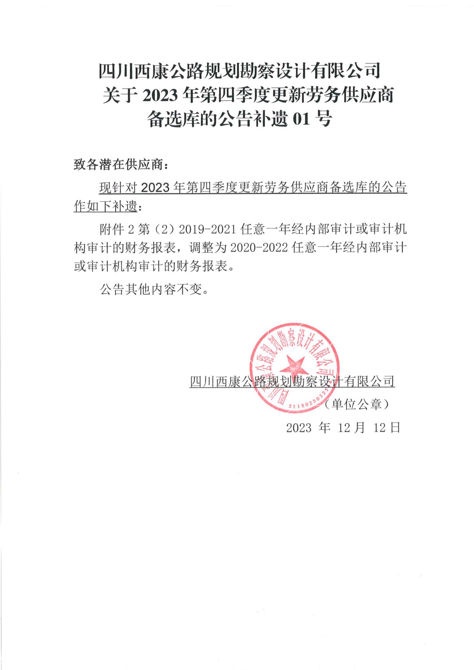 四川西康公路規(guī)劃勘察設(shè)計(jì)有限公司關(guān)于2023年第四季度更新勞務(wù)供應(yīng)商備選庫(kù)的公告補(bǔ)遺01號(hào)