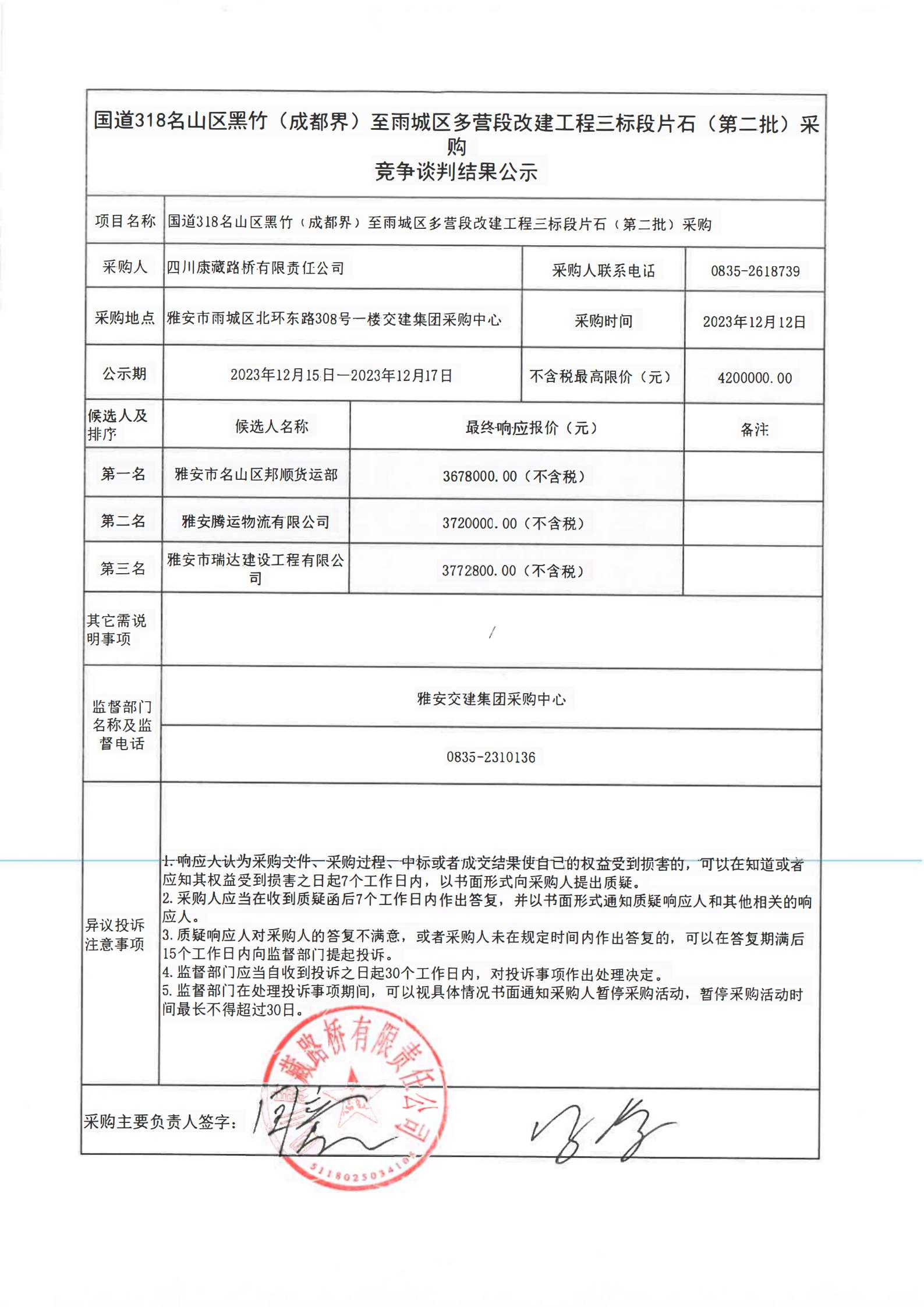 四川康藏路橋有限責(zé)任公司國道318名山區(qū)黑竹(成都界)至雨城區(qū)多營段改建工程三標(biāo)段片石(第二批)采購競爭談判結(jié)果