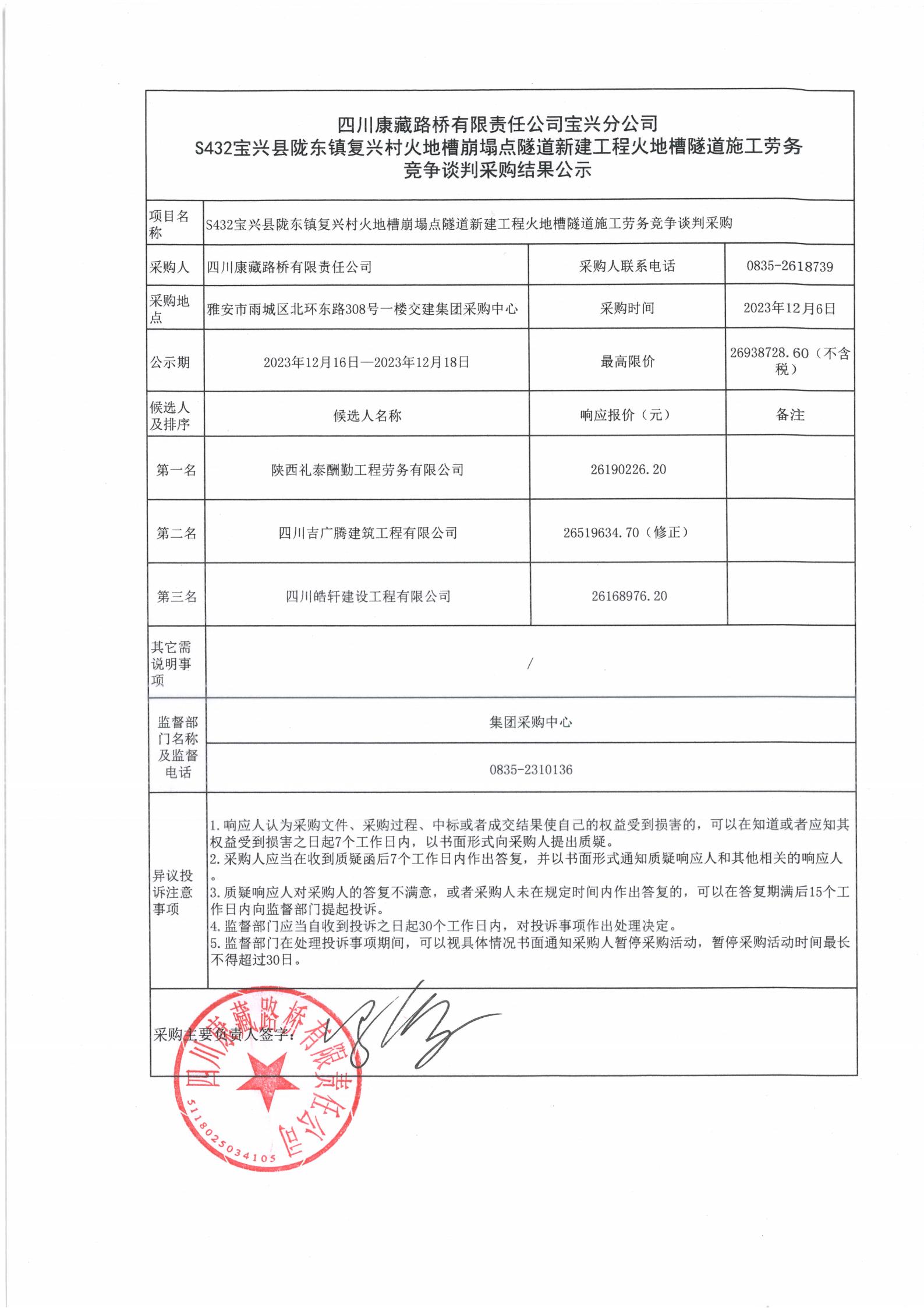 四川康藏路橋有限責(zé)任公司寶興分公司S432寶興縣隴東鎮(zhèn)復(fù)興村火地槽崩塌點隧道新建工程火地槽隧道施工勞務(wù)競爭談判采購結(jié)果公示