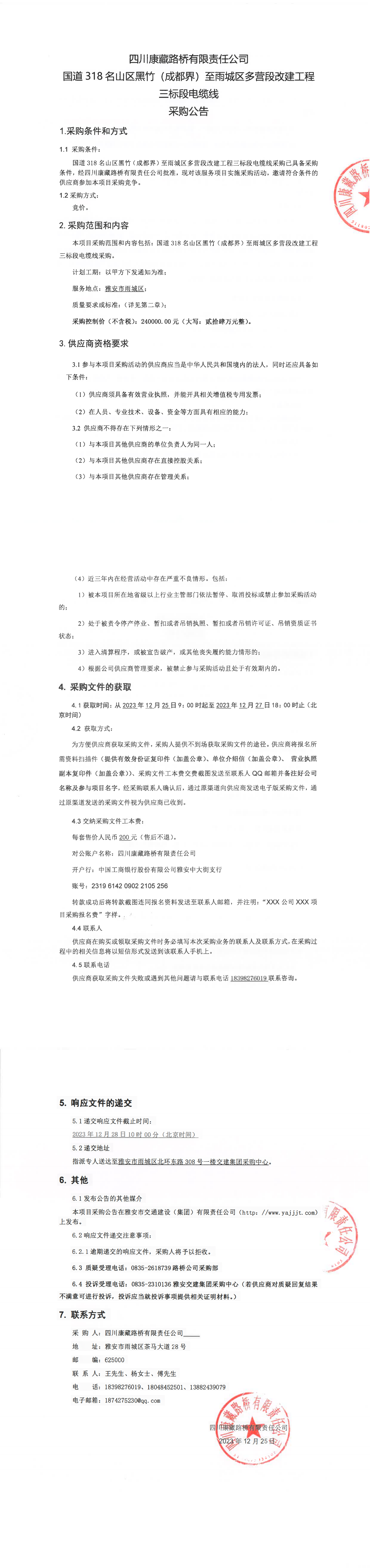 四川康藏路橋有限責(zé)任公司國道318名山區(qū)黑竹(成都界)至雨城區(qū)多營段改建工程三標(biāo)段電纜線采購公告