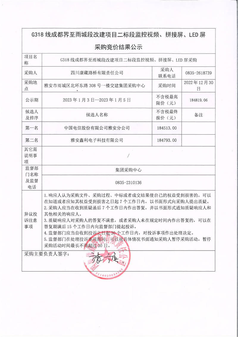 四川康藏路橋有限責任公司G318線成都界至雨城段改建項目二標段監(jiān)控視頻、拼接屏、LED屏采購競價結(jié)果公示