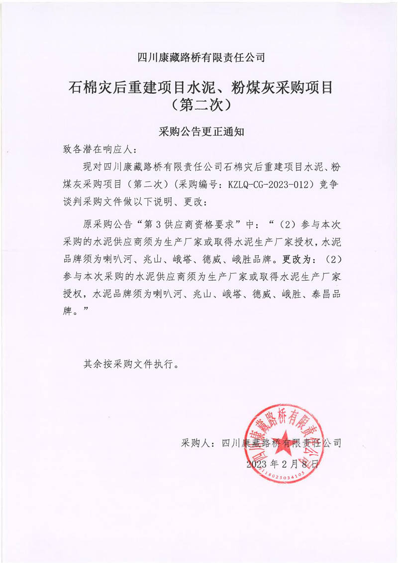 四川康藏路橋有限責任公司石棉災后重建項目水泥、粉煤灰采購項目(第二次)采購公告更正通知