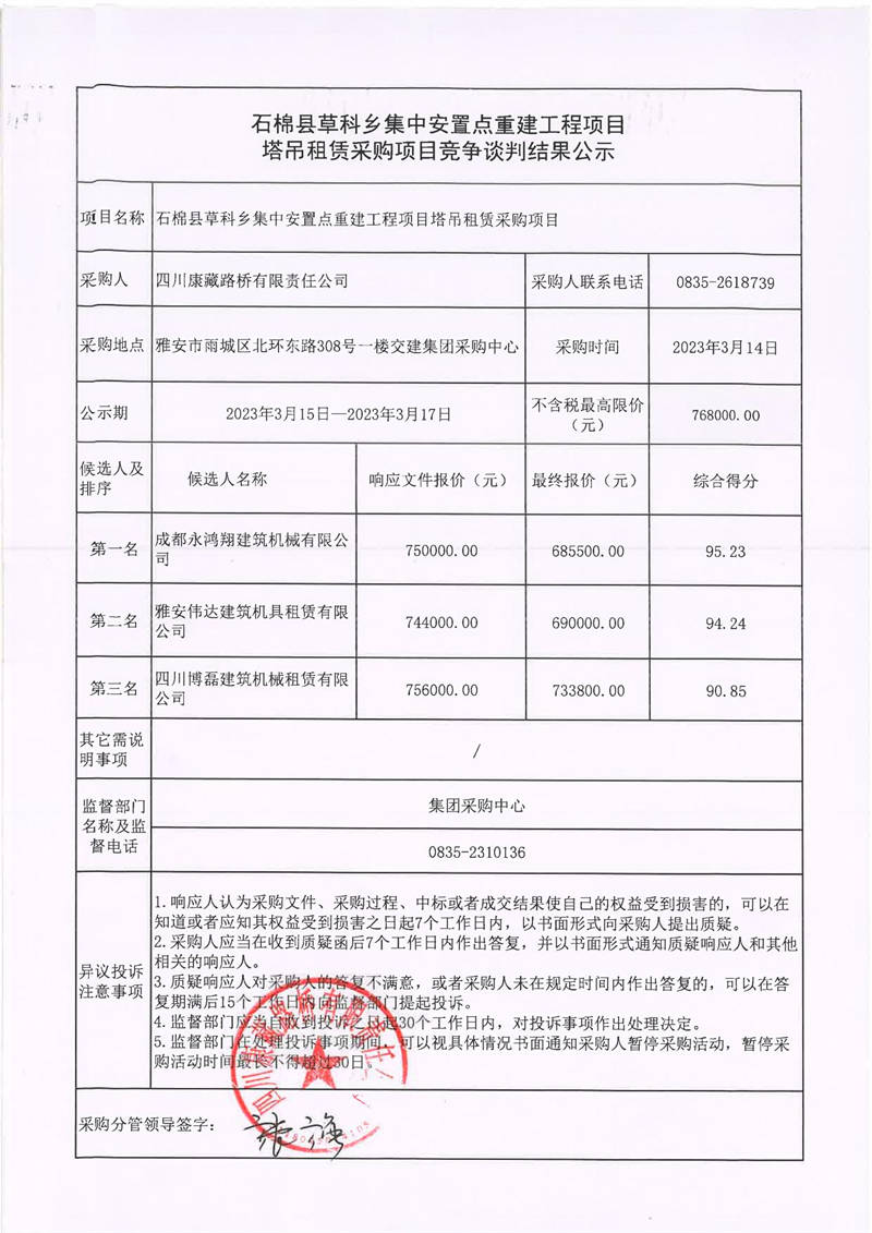 四川康藏路橋有限責任公司石棉草科鄉(xiāng)集中安置點重建工程項目塔吊租賃采購競爭談判結果公示