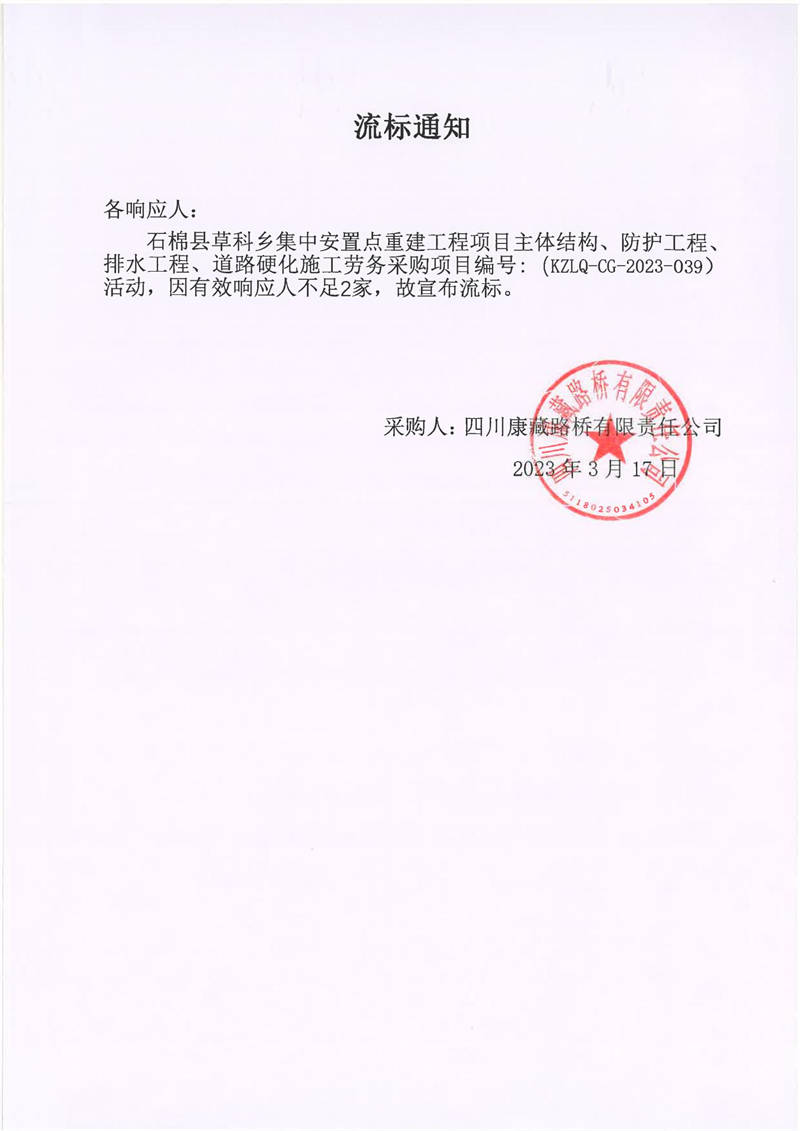 四川康藏路橋有限責(zé)任公司石棉草科鄉(xiāng)集中安置點(diǎn)重建工程項目主體結(jié)構(gòu)、防護(hù)工程、排水工程、道路硬化施工勞務(wù)采購流標(biāo)通知