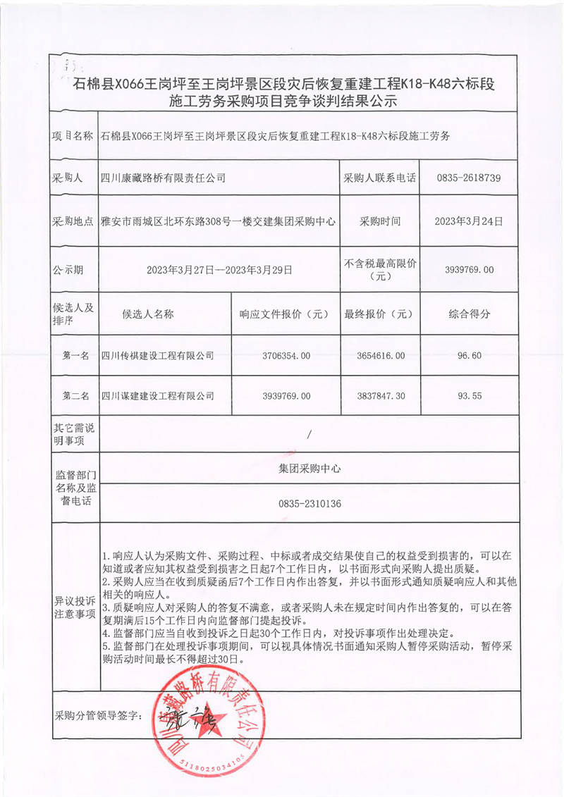 四川康藏路橋有限責(zé)任公司石棉縣X066王崗坪至王崗坪景區(qū)段災(zāi)后恢復(fù)重建工程K18-K48六標(biāo)段施工勞務(wù)采購項(xiàng)目競爭談判結(jié)果公示