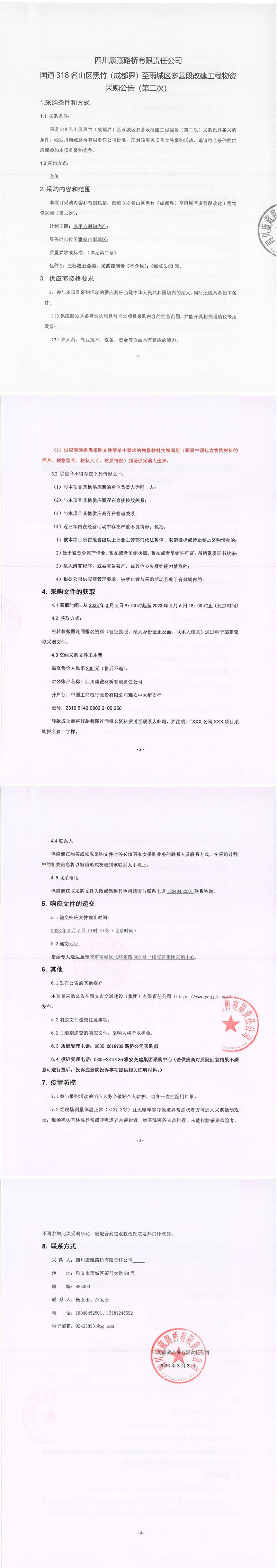 四川康藏路橋有限責任公司國道318名山區(qū)黑竹(成都界)至雨城區(qū)多營段改建工程物資采購公告(第二次)