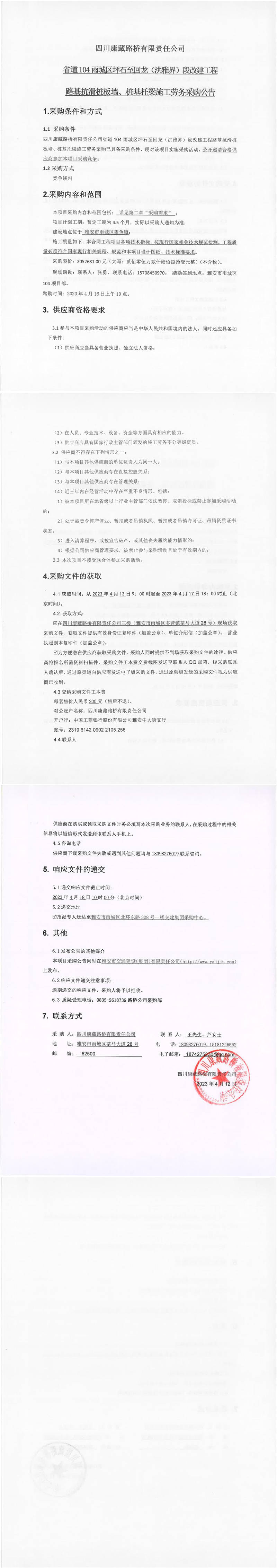 四川康藏路橋有限責任公司省道104雨城區(qū)坪石至回龍(洪雅界)段改建工程路基抗滑樁板墻、樁基托梁施工勞務采購公告