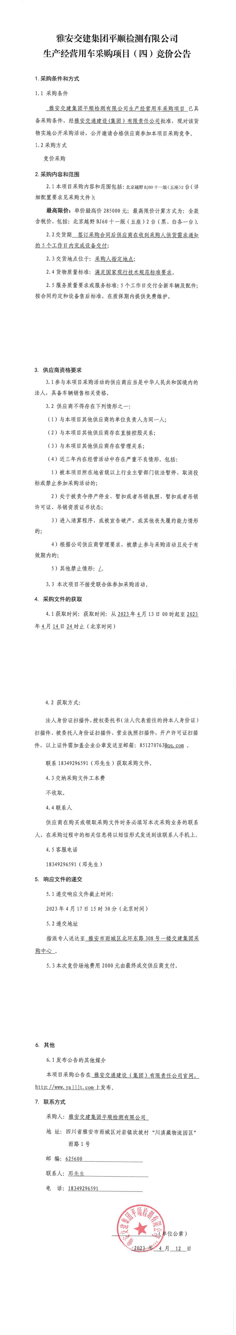 雅安交建集團(tuán)平順檢測(cè)有限公司平順公司生產(chǎn)經(jīng)營(yíng)用車(chē)采購(gòu)項(xiàng)目(四)競(jìng)價(jià)公告