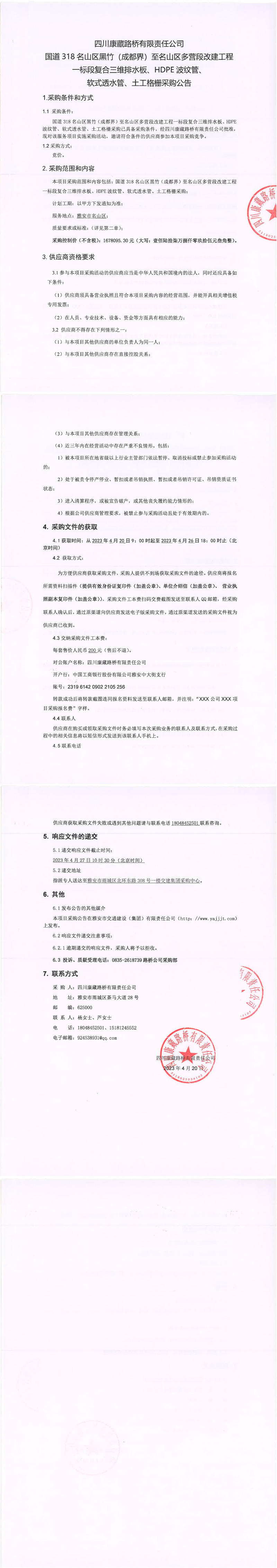 四川康藏路橋有限責(zé)任公司國道318名山區(qū)黑竹(成都界)至雨城區(qū)多營段改建工程一標段復(fù)合三維排水板、HDPE波紋管、軟式透水管、土工格柵采購公告