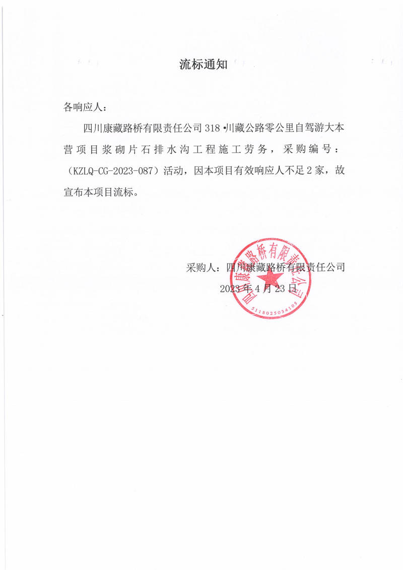 四川康藏路橋有限責(zé)任公司318·川藏公路零公里自駕游大本營項目漿砌片石排水溝工程施工勞務(wù)流標通知
