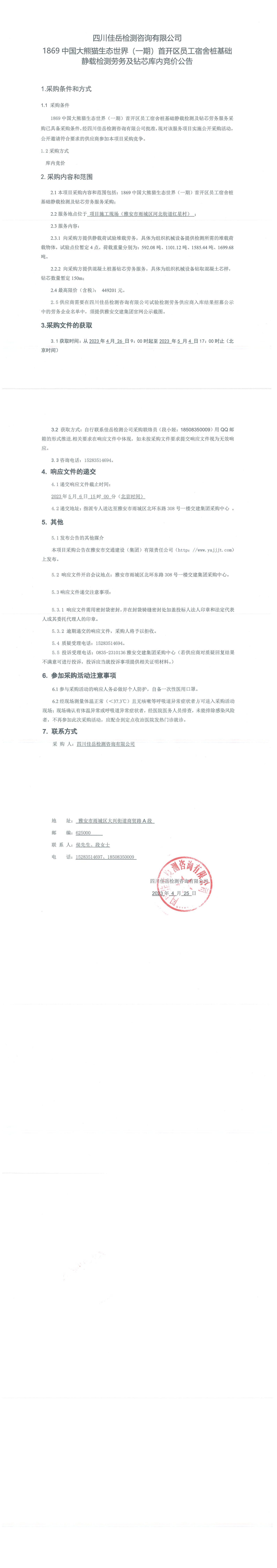 四川佳岳檢測咨詢有限公司1869中國大熊貓生態(tài)世界(一期)首開區(qū)員工宿舍樁基礎(chǔ)靜載檢測勞務(wù)及磚芯庫內(nèi)競價公告