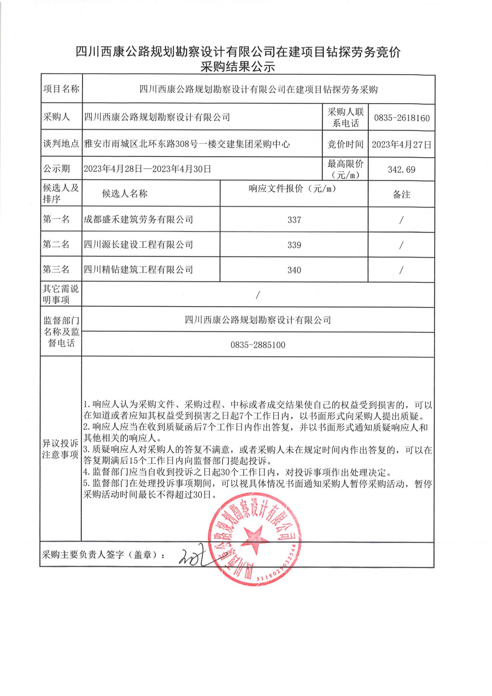 四川西康公路規(guī)劃勘察設(shè)計公司在建項目鉆探勞務(wù)競價采購結(jié)果公示