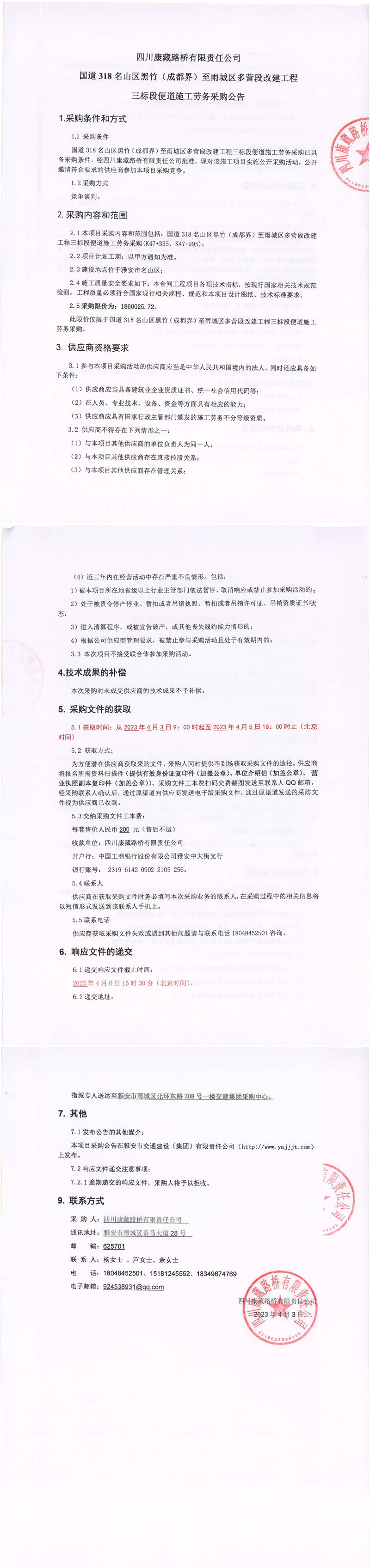 四川康藏路橋有限責任公司國道318名山區(qū)黑竹(成都界)至雨城區(qū)多營段改建工程三標段便道施工勞務(wù)采購公告