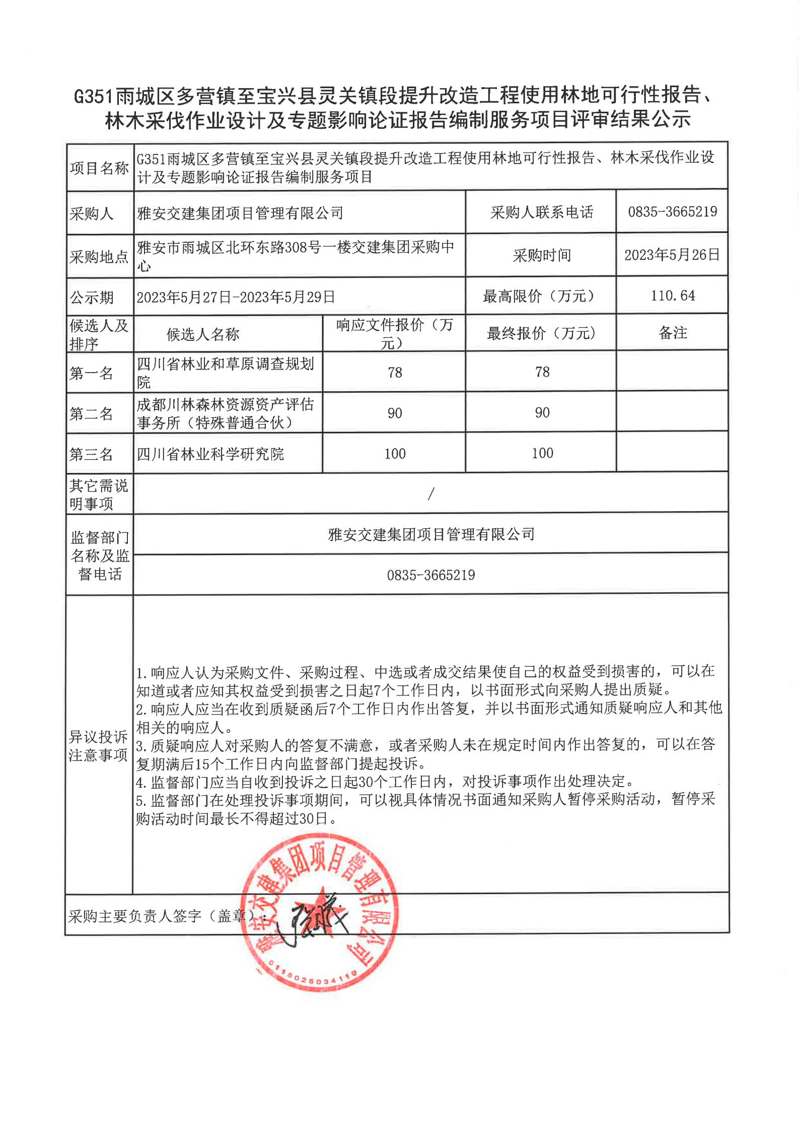 雅安交建集團(tuán)項目管理有限公司G351雨城區(qū)多營鎮(zhèn)至寶興縣靈關(guān)鎮(zhèn)段提升改造工程使用林地可行性報告、林木采伐作業(yè)設(shè)計及專題影響論證報告編制服務(wù)項目評審結(jié)果公示