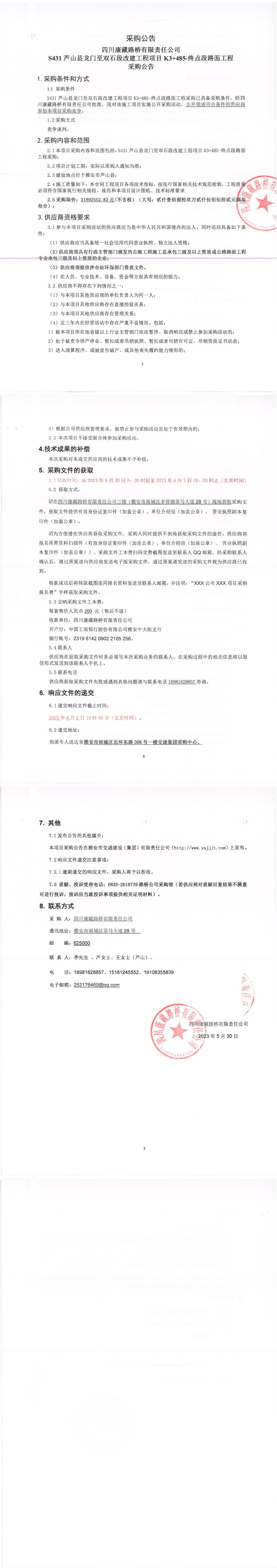 四川康藏路橋有限責(zé)任公司S431蘆山縣龍門至雙石段改建工程項(xiàng)目K3+485-終點(diǎn)段路面工程采購(gòu)公告