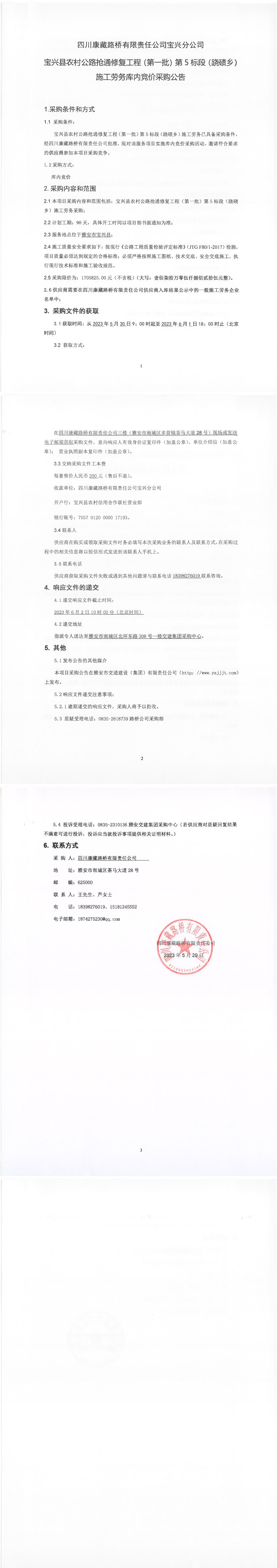 四川康藏路橋有限責(zé)任公司寶興農(nóng)村公路搶通修復(fù)工程(第一批)第5標(biāo)段(蹺磧鄉(xiāng))施工勞務(wù)庫內(nèi)競(jìng)價(jià)采購公告