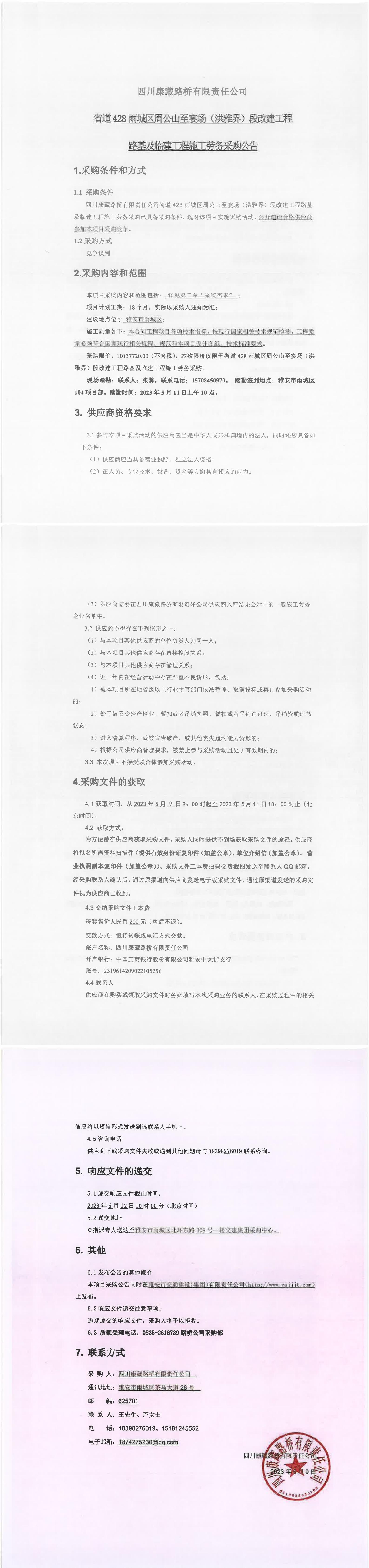 四川康藏路橋有限責(zé)任公司省道428雨城區(qū)周公山至宴場(洪雅界)段改建工程路基及臨建工程施工勞務(wù)采購公告