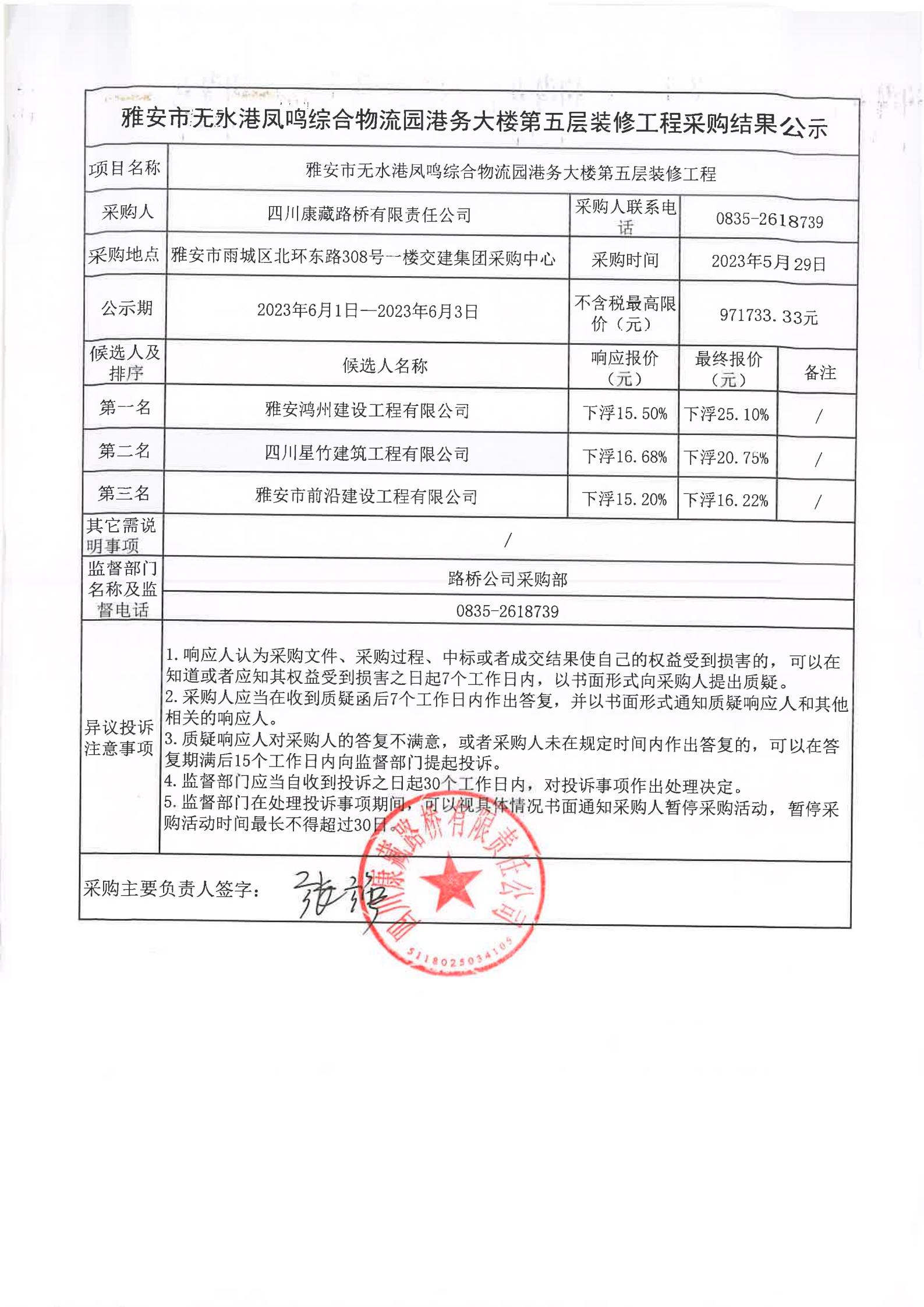 四川康藏路橋有限責任公司雅安市無水港鳳鳴綜合物流園港務大樓第五層裝修工程采購結果公示