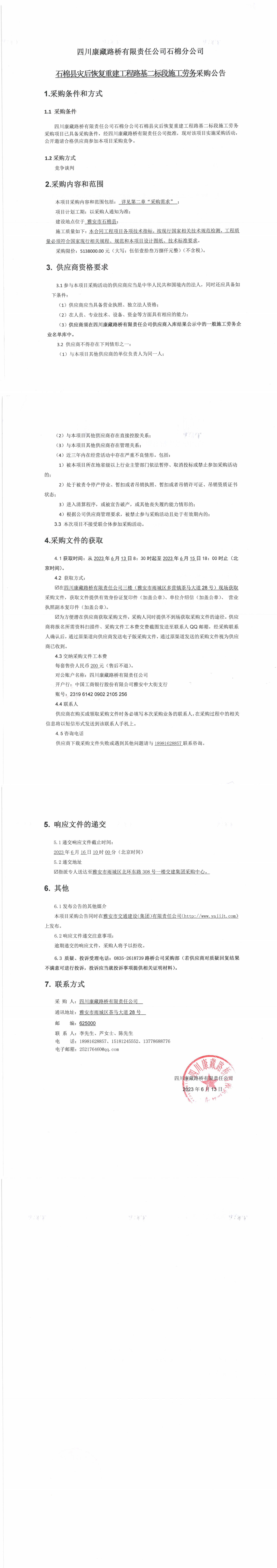 四川康藏路橋有限責(zé)任公司石棉分公司石棉縣災(zāi)后恢復(fù)重建工程路基二標(biāo)段施工勞務(wù)采購(gòu)公告